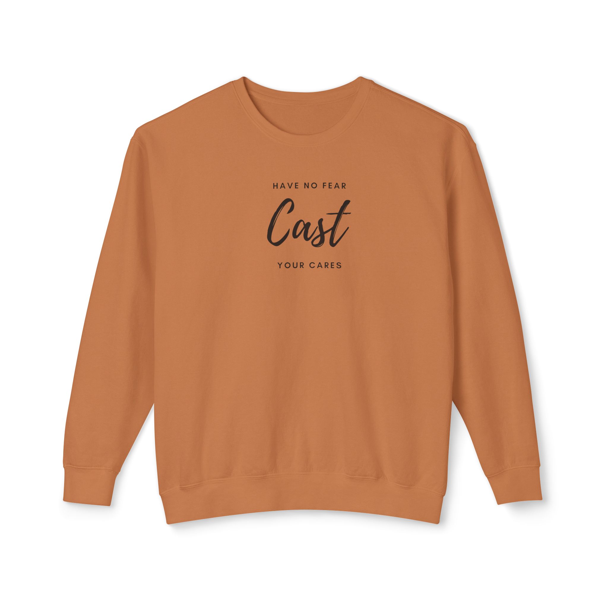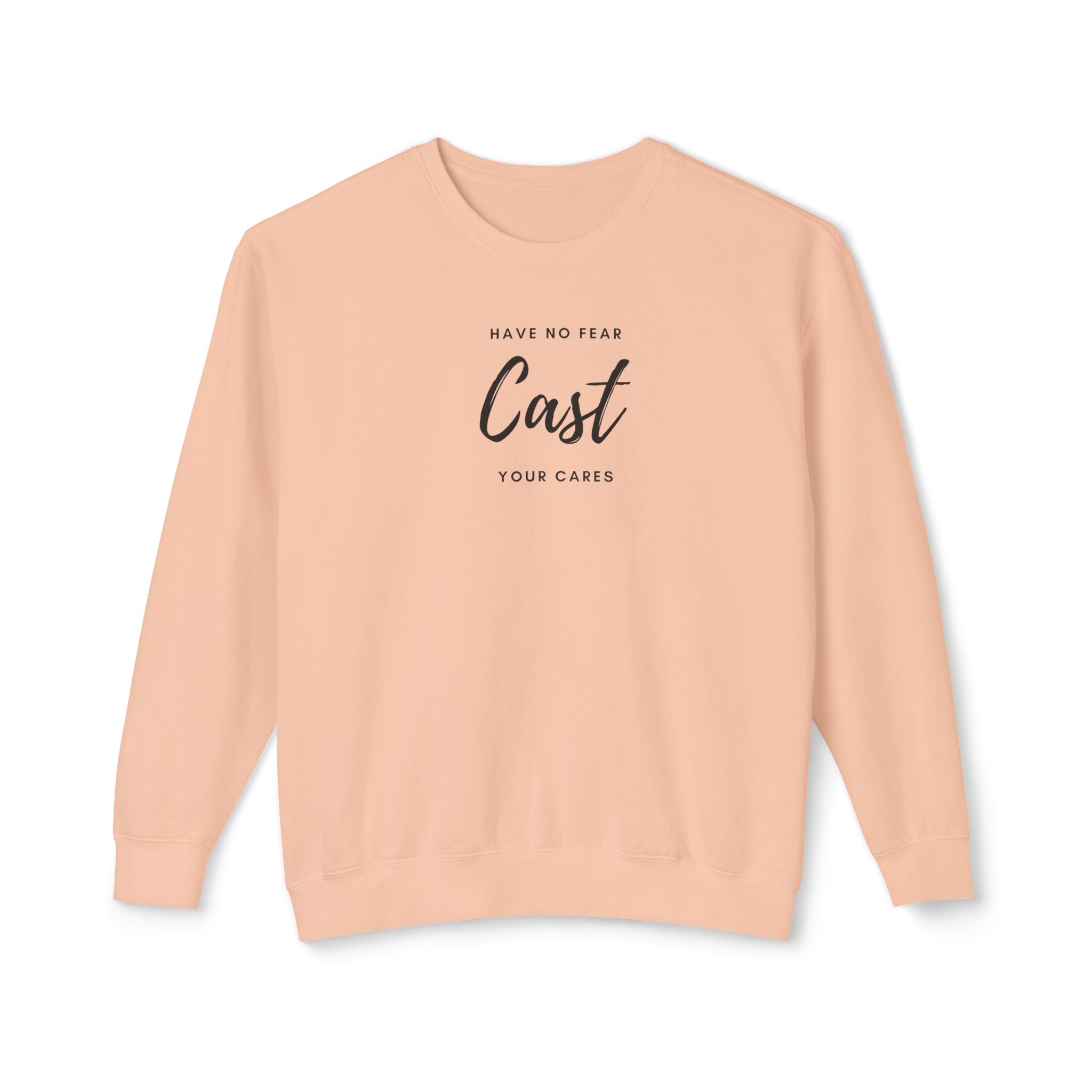 This comforting statement motivates the soul to submit and humble ourselves under the loving power of God, who cares about you (1Peter 5:7). We can experience no fear when we cast our hearts to Him! This unisex lightweight crewneck sweatshirt is breathable and versatile for both casual and daily wear. It combines comfort and spiritual meaning, making it ideal for anyone seeking to express their faith through their everyday style.