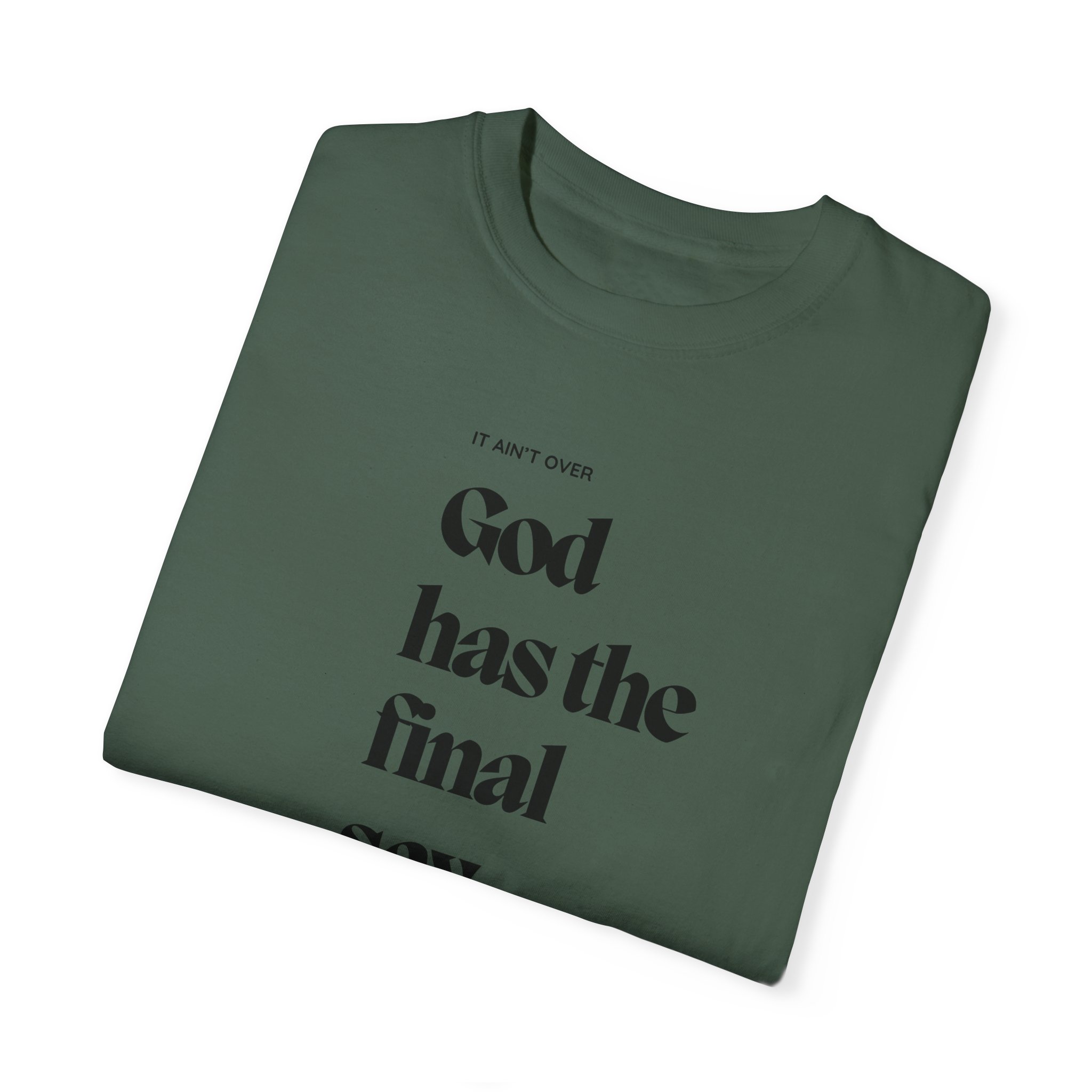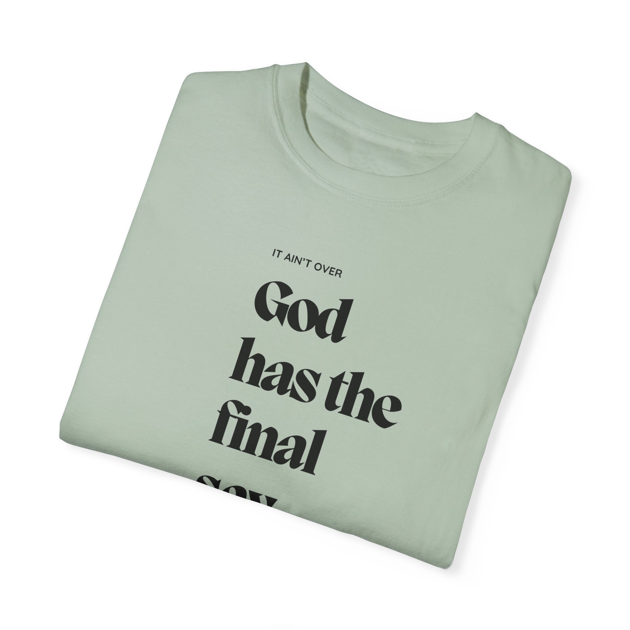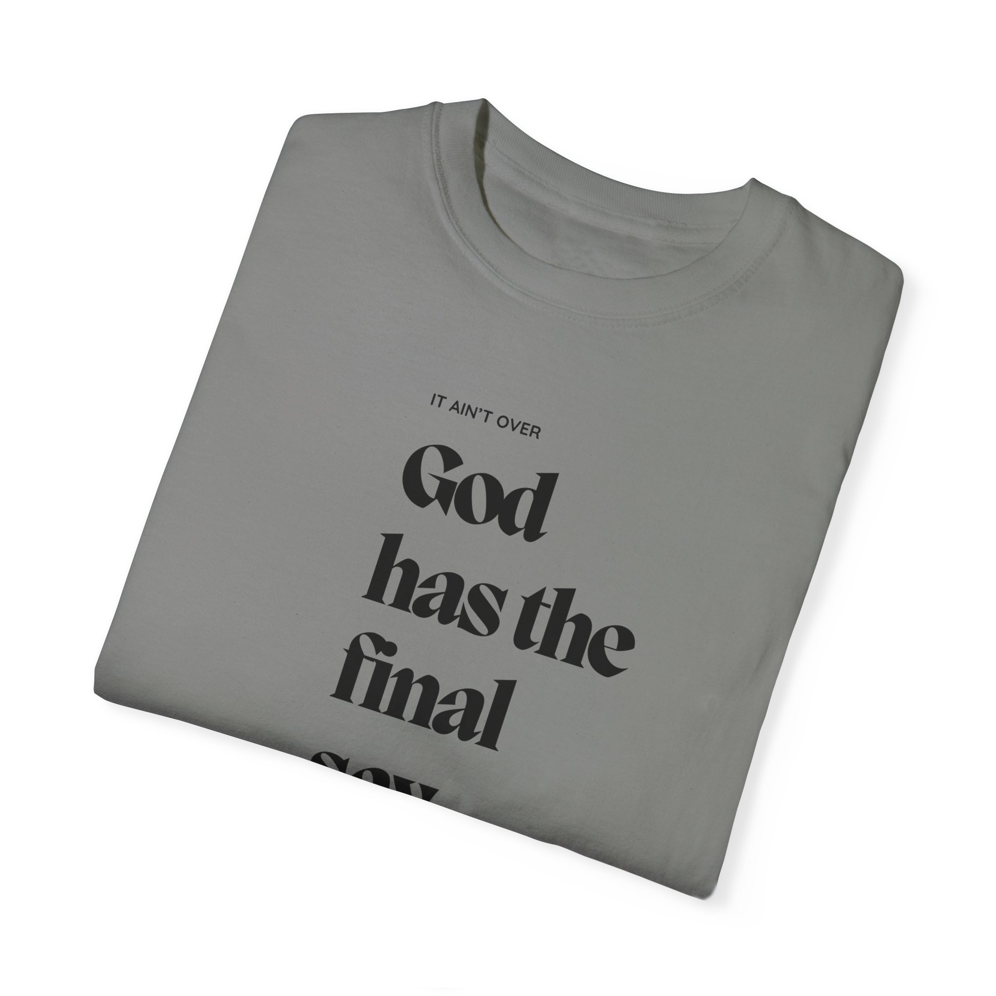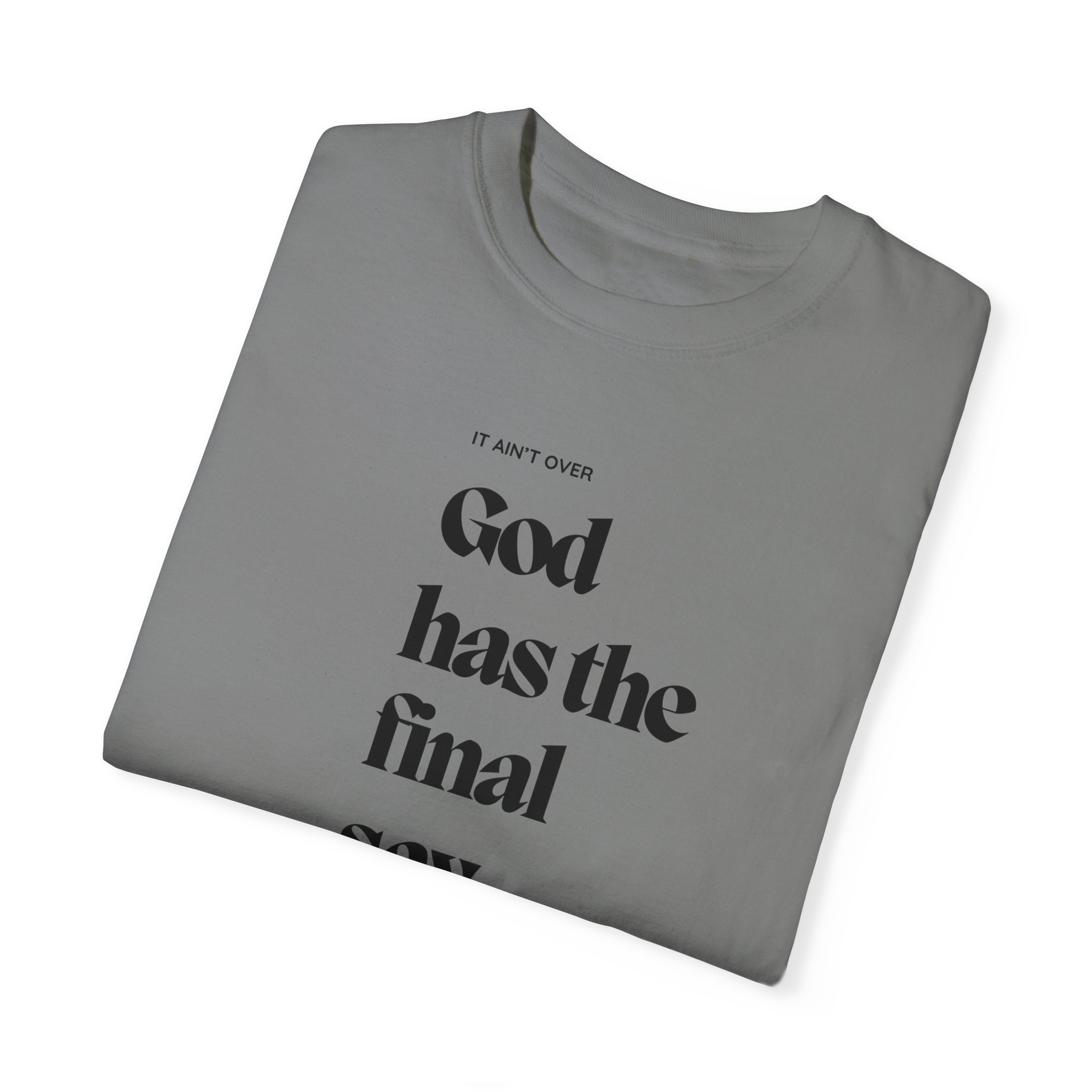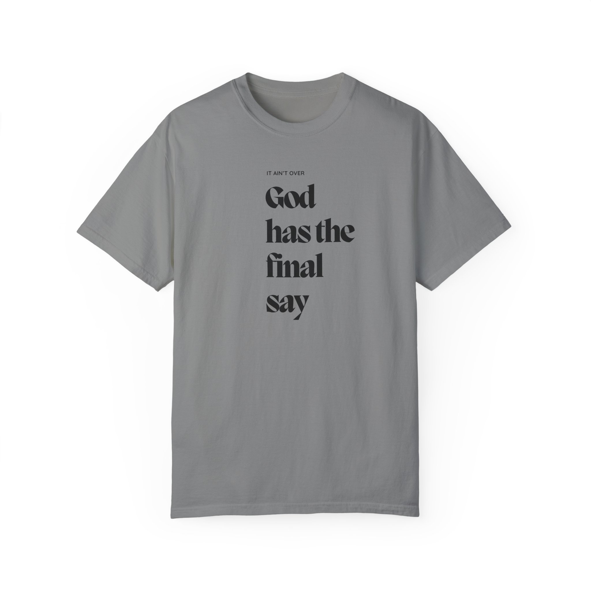 This encouraging truth reminds the soul that God has the final say in everything. No matter what you are facing, the world and man does not have the final say! It is not over until God says that it is over. When He acts, who can reverse it? This unisex T-shirt features a classic crew neckline and relaxed fit, perfect for daily wear. It combines comfort and spiritual meaning, making it ideal for anyone seeking to express their faith through their everyday style.